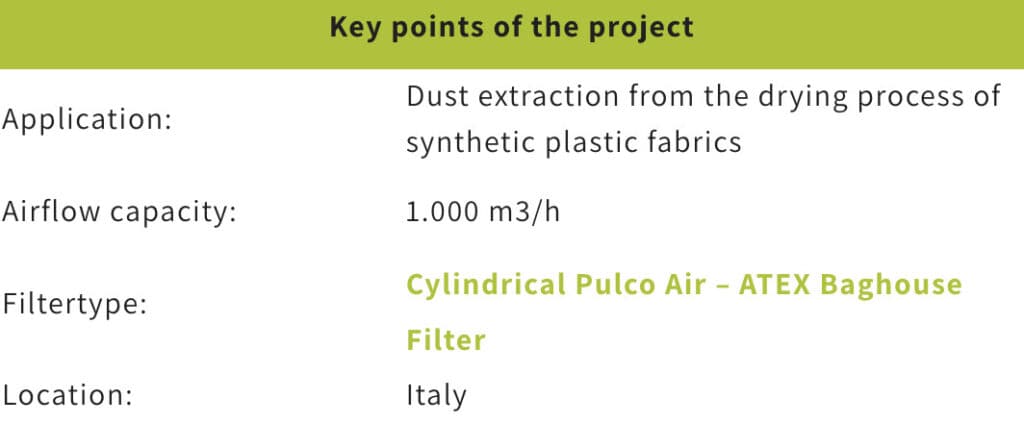 In the plastic manufacturing industry, where pneumatic conveying is a standard method for transporting plastic pellets and powders, these filters provide a reliable and safe solution. One of our customers faced a specific challenge: extracting fine dust generated by the drying of synthetic plastic fabrics. Traditional filtration systems proved ineffective, exposing pressure management issues, particle accumulation, and safety risks for the entire plant.