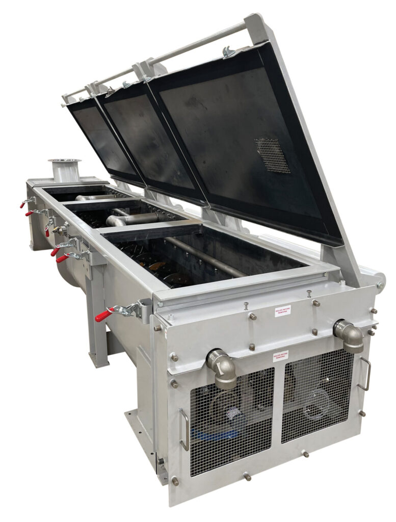 To prevent treated APCr from setting and minimise operator exposure, a clean-in-place system for the mixer was also included which ran at the event of a production shift. Special swivelling spray bars with jet profiled nozzles were utilised to provide coverage of high pressure cleaning water along the length and breadth of the mixer targeting all of the areas whist the screws ran. For added access ease, counterbalanced covers were also included on this large machine to enable the inside of the mixer to be effortlessly and safely inspected by one operator and allow any maintenance required to be easily carried out.