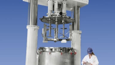 The double cone vessel is rated for vacuum up to 29.5” Hg. Stainless steel type 304 product contact parts are polished to a 240-grit finish for easy cleaning.