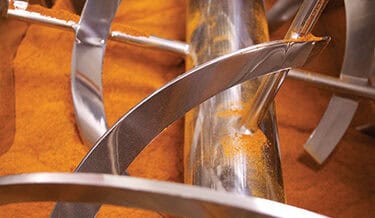The solid double ribbon agitator is direct-driven up to 56 rpm by a 7.5 HP TEFC inverter-duty motor through a right-angle reducer. The stainless steel shaft includes heavy-duty ribbon support arms, while two-piece stuffing boxes with air-purged lantern rings and replaceable Teflon® packing provide effective sealing. A pneumatically operated 6″ dust-tight knife gate valve with tri-clamp outlet adaptor enables controlled discharge and simple cleaning.