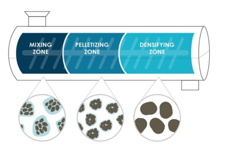 As material moves down the length of the mixer, the centrifugal force within the mixing trough causes particles to form small, condensed agglomerates, which increase in density as they continue toward discharge. Material is processed for a predetermined retention time – typically in the range of 10 to 20 seconds, based on desired product qualities, at which point it is discharged from the mixer.