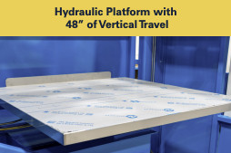 The hydraulic lift platform, rated for 4,000 lbs with 48 inches of vertical travel, was critical for accommodating taller supersacks and ensuring full-column conditioning. The extended lift range allowed precise vertical positioning of the bag so the twin pivoting conditioning arms could engage at optimal pressure points throughout the material mass.
