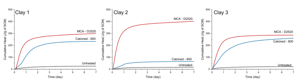 Figure 3: MCA-treated clays consistently outperform clay calcinated at 800 °C, indicating higher pozzolanic activity, especially in clay 2 with highest mica amounts.