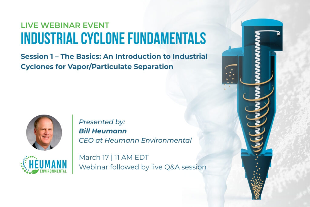 Heumann Environmental Company will host a live technical webinar titled “Industrial Cyclone Fundamentals pt.1 — The Basics: An Introduction to Industrial Cyclones for Vapor/Particulate Separation” on March 17, 2026 at 11:00 AM EDT.
