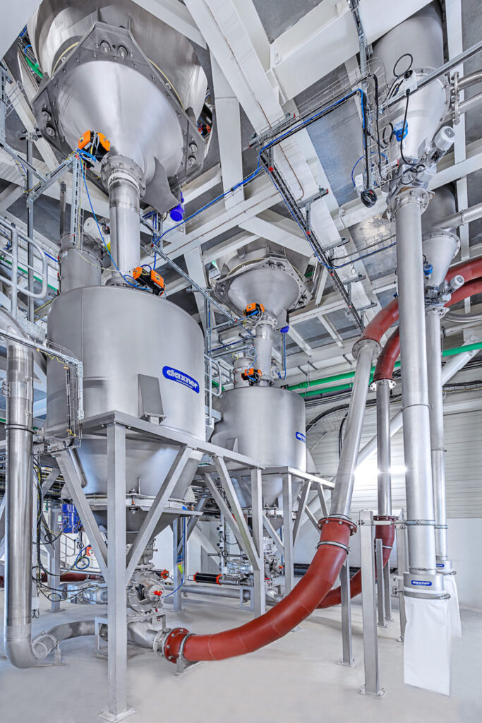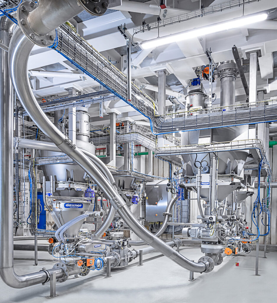 One of the key technical challenges involved designing pneumatic conveying systems with a throughput capacity of up to 50 tons per hour while maintaining drying and cooling for process air throughout the system. In addition to precise calculations and well-planned system architecture, hygroscopic and temperature-sensitive raw materials had handled with greatest care. Given the client’s global market presence, it was critical that all formulations be processed with uncompromising quality and batch purity. To support this, all system components were designed to prevent material build-up and ensure easy accessibility and cleanability of equipment. Every new system element was implemented in hygienic design, including mechanisms for quick changeovers.