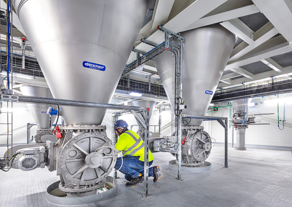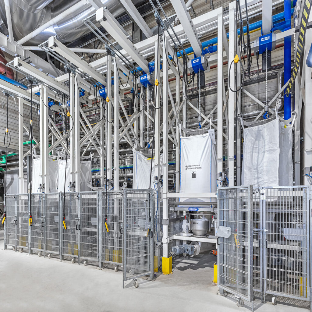 Additionally, 18 major component silos are fed via pneumatic conveying systems from both the bulk silos and bulk bag (super sack) unload stations. Component allocation was carefully planned as part of an explosion-protection concept. From the major component silos, raw materials are dosed into scales according to specific recipes and conveyed via pneumatic lines to the receiving hoppers in the milling tower—minimizing any risk of cross-contamination.